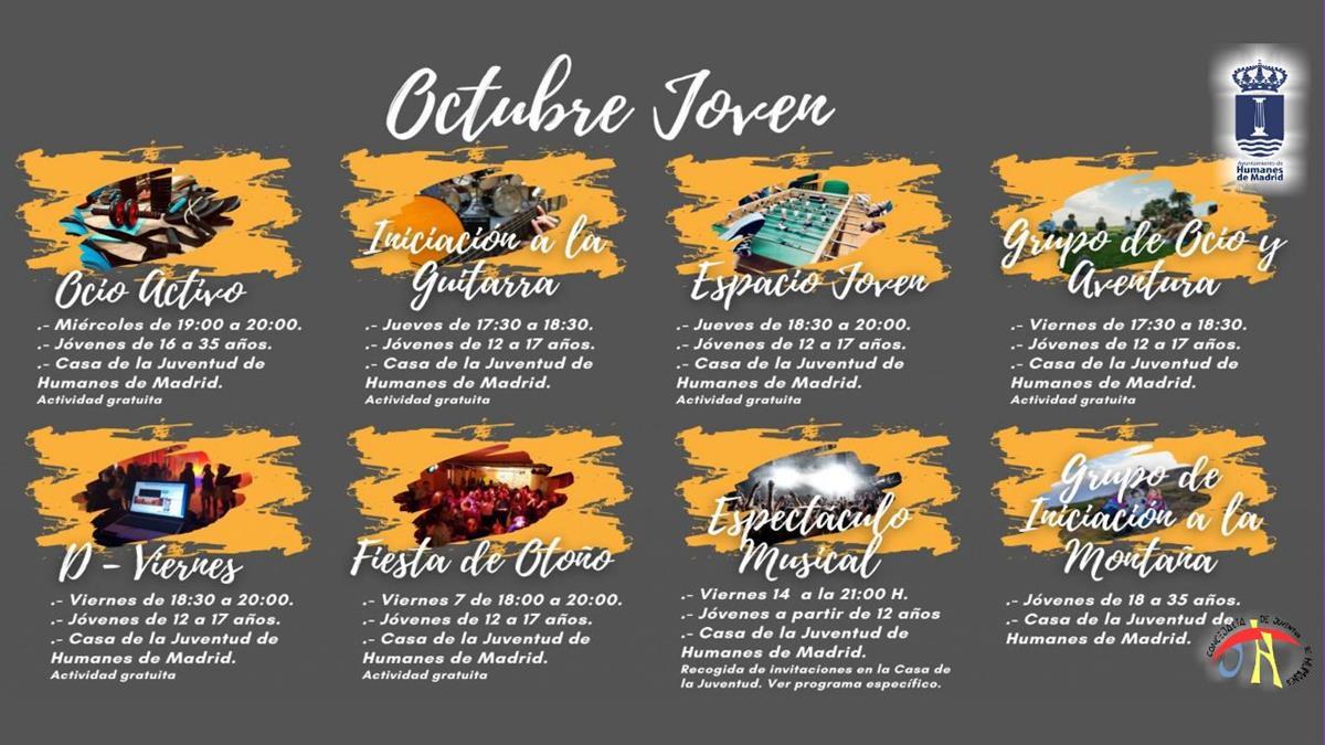 El Ayuntamiento de Humanes, a través de su concejalía de Juventud ha programado las siguientes actividades para el mes de octubre: