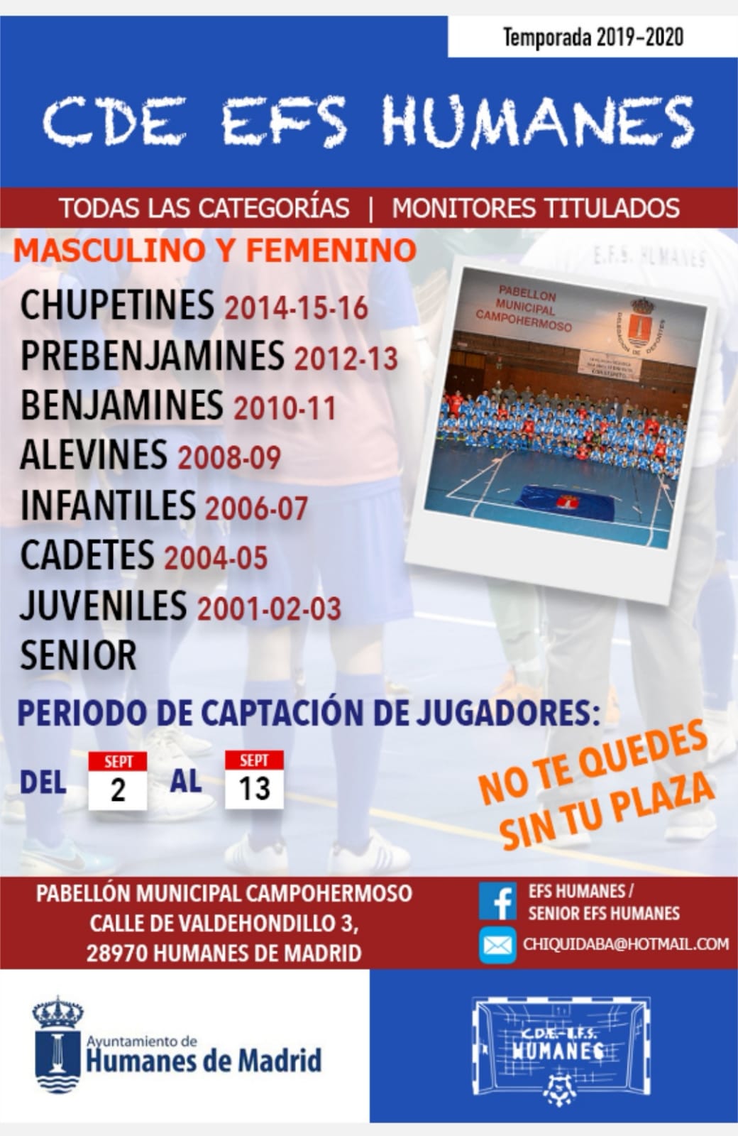 Los vecinos y vecinas de Humanes de Madrid que disfruten jugando al fútbol están de enhorabuena, porque el Club Deportivo Escuela de Fútbol Sala de Humanes (CDE EFS Humanes) está buscando nuevos jugadores y jugadoras para los equipos de chupetines, prebenjamines, benjamines, alevines, infantiles, cadetes, juveniles y senior.
