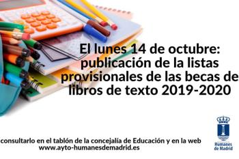 Ya están publicados los listados definitivos de las becas de libros de texto 2019-2020, pero si tras consultar las listas en la web municipal, en el tablón de anuncios de la Concejalía de Educación o en redes sociales consideras necesario realizar una reclamación podrás hacerlo desde el siguiente día hábil tras la publicación de las listas, el martes 15 de octubre.