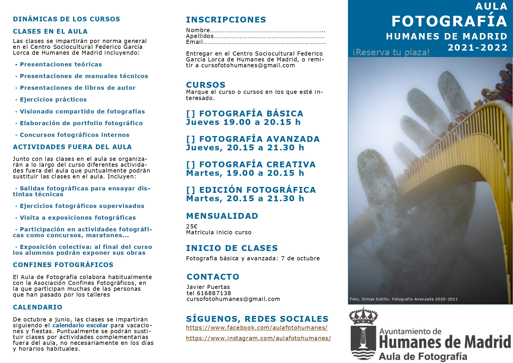 Para más información, los interesados pueden ponerse en contacto con cursofotohumanes@gmail.com o por teléfono 616 887 138. Los horarios son los siguientes: