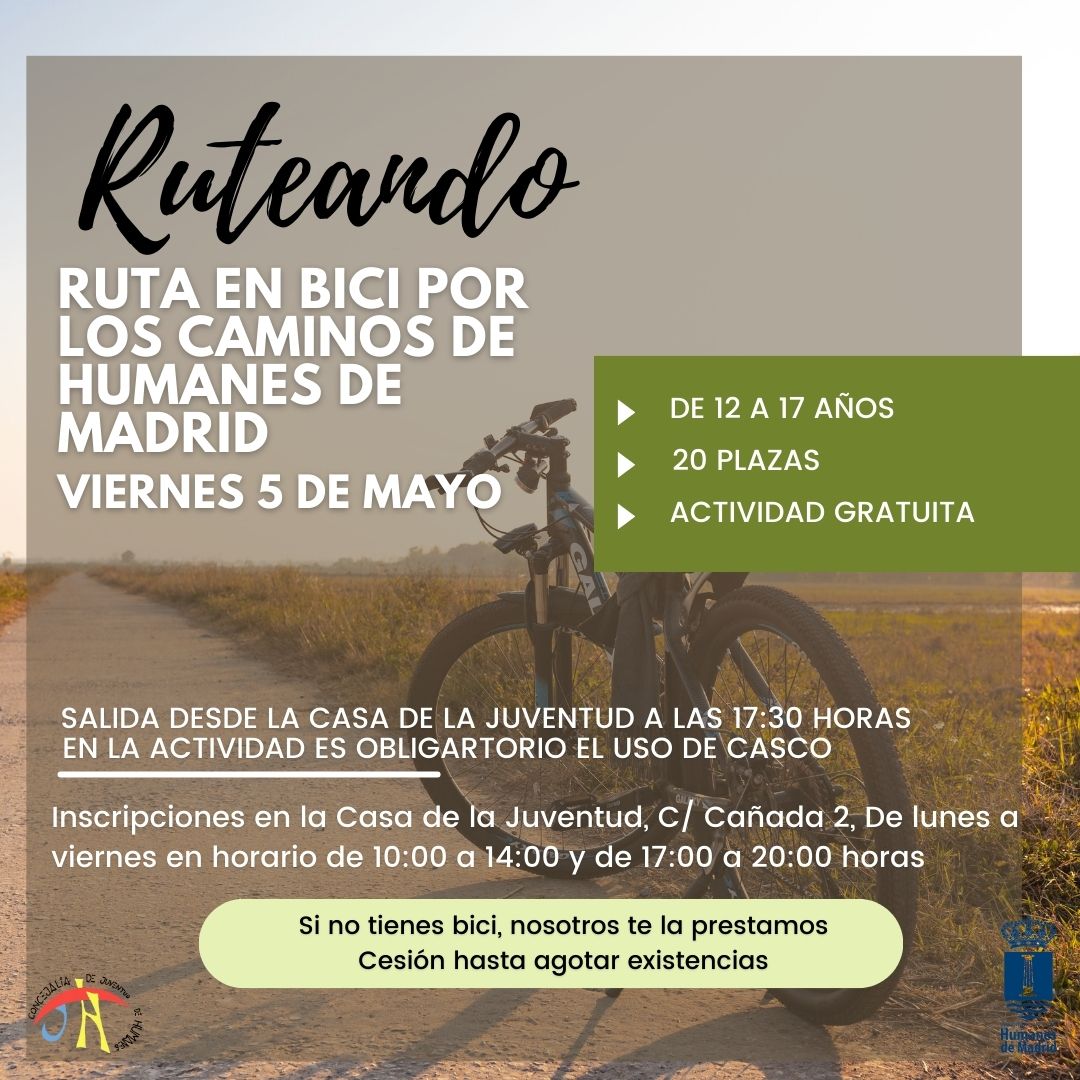 La Concejalía de Juventud del Ayuntamiento de Humanes de Madrid organiza una actividad de ruta en bici.