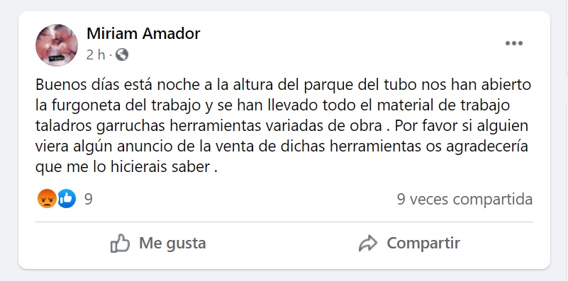 Una vecina del municipio Humanes de Madrid ha utilizado Facebook para denunciar el robo de material de trabajo. La humanense compartía esta mañana, en un grupo de vecinos de la localidad, una publicación desde su perfil en la que relataba lo que le había sucedido.