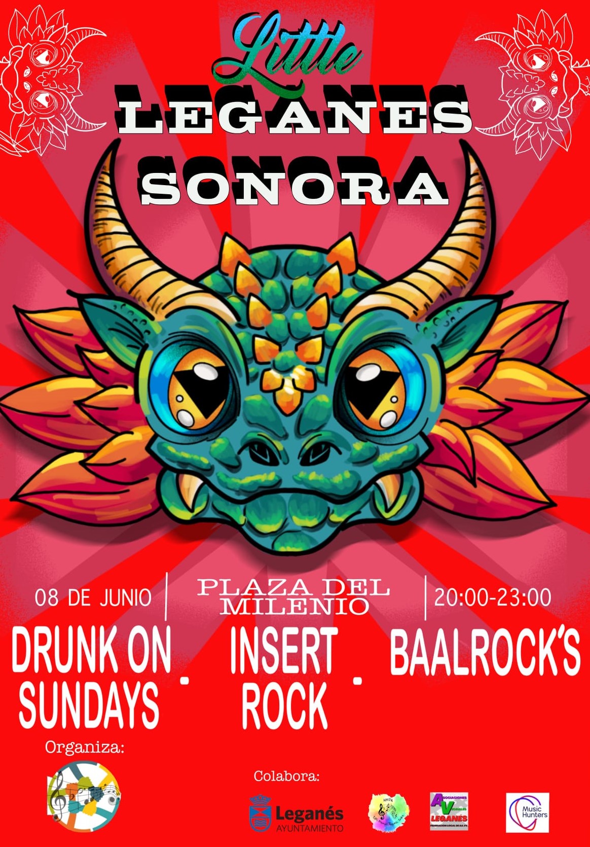 Para el sábado, en el mismo escenario, doble ración de conciertos, ya que tendremos en sesión vermú a los locales Damdara, quienes harán las delicias de todos aquellos que se acerquen por el festival. Para la tarde, y después de tomarnos un pequeño respiro, llegará el momento de disfrutar de Drunk on Sunday, Inser Rock, Baalroxks, con los que se pondrá el punto y final a la primera tanda de conciertos de la primera edición de Little Leganés Sonora. Los conciertos son de carácter gratuito hasta completar aforo.