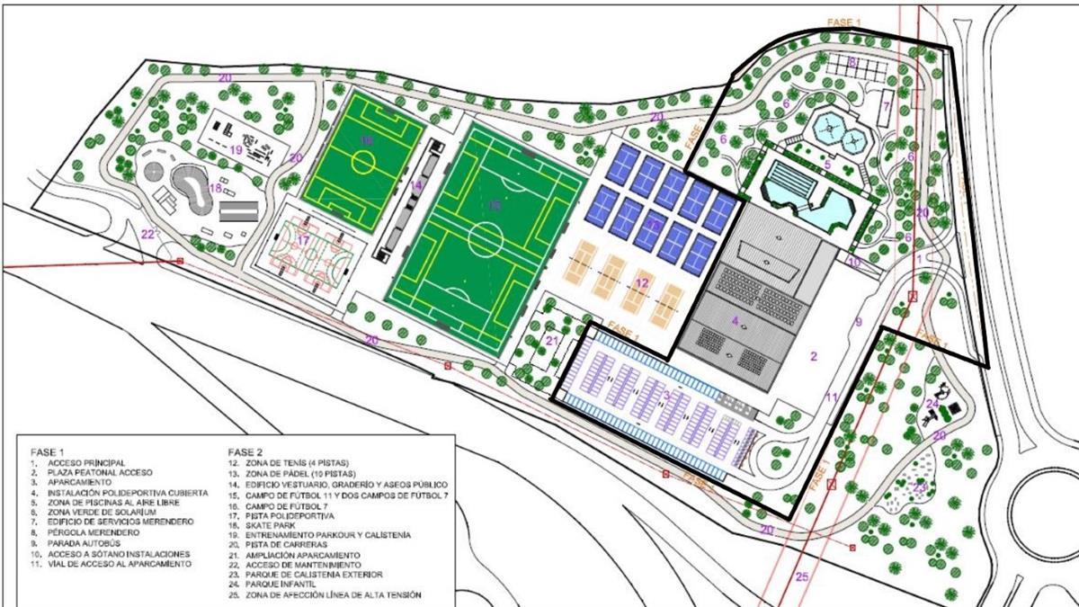 La empresa a la que le ha sido adjudicado el anteproyecto quiere realizar las obras en dos fases. La primera de ellas, la cual es el objeto del proyecto, consistiría en la construcción del acceso principal, una plaza peatonal de acceso al centro, un aparcamiento, una instalación deportiva cubierta y una zona de piscina al aire libre con vaso para adultos e infantil, que vendría a ser lo que es la antigua piscina de Solagua. Además de esto, en el anteproyecto presentado por Serdel SAP incluiría una zona verde de Solárium, un edificio de servicios y merendero, una pérgola de merendero, un estacionamiento de autobuses, un acceso a sótano y unos viales de circulación rodada al aparcamiento.