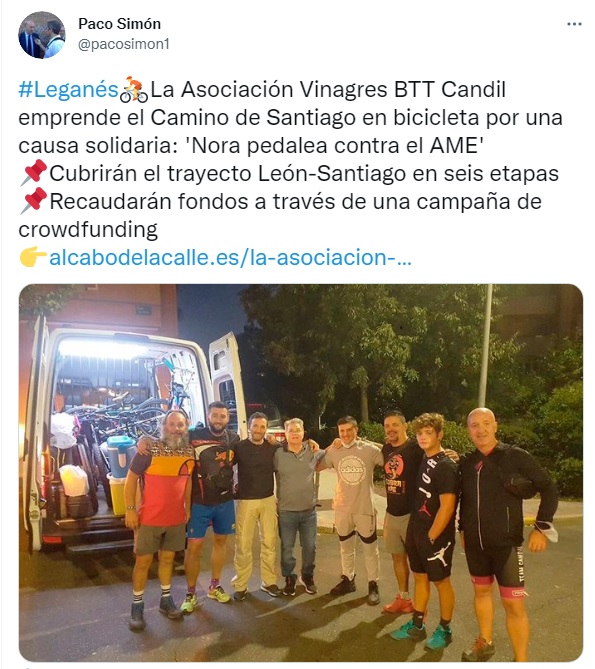 Ocho integrantes de la asociación Vinagres BTT Candil de Leganés están realizando el Camino de Santiago en bicicleta para recaudar fondos con el objetivo de crear una organización que trabaje para ayudar a los niños que nacen con Atrofia Muscular Espinal (AME).