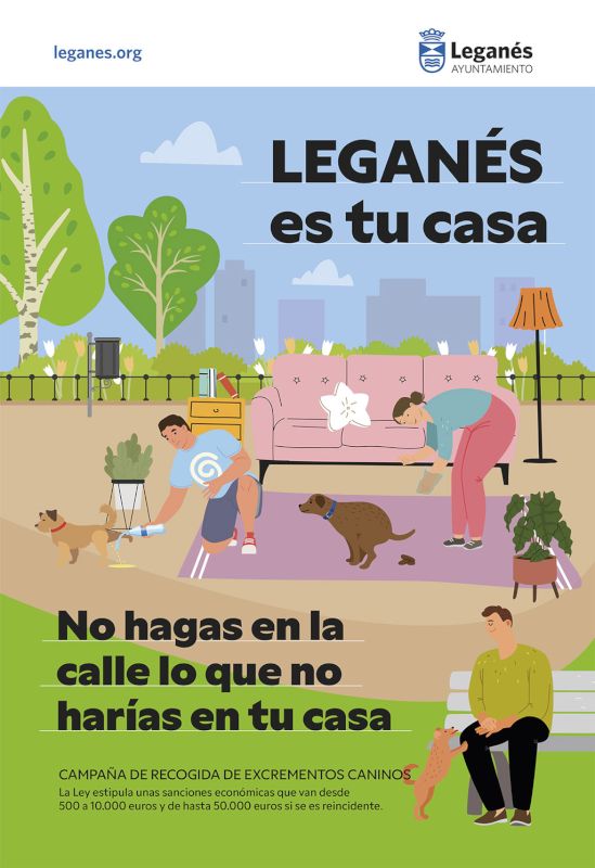 El Ayuntamiento de Leganés ha lanzado una campaña de información y concienciación para que los vecinos sean responsables con la obligaciones que conlleva ser propietario de un animal doméstico. Bajo el lema "Leganés es tu casa. No hagas en la calle lo que no harías en tu casa" , se ha instalado cartelería en los mupis municipales en los que se recuerda que las sanciones por no recoger los excrementos de sus perros oscilan entre los 500 y los 10.000 euros y pueden llegar hasta los 50.000 euros si es reincidente.