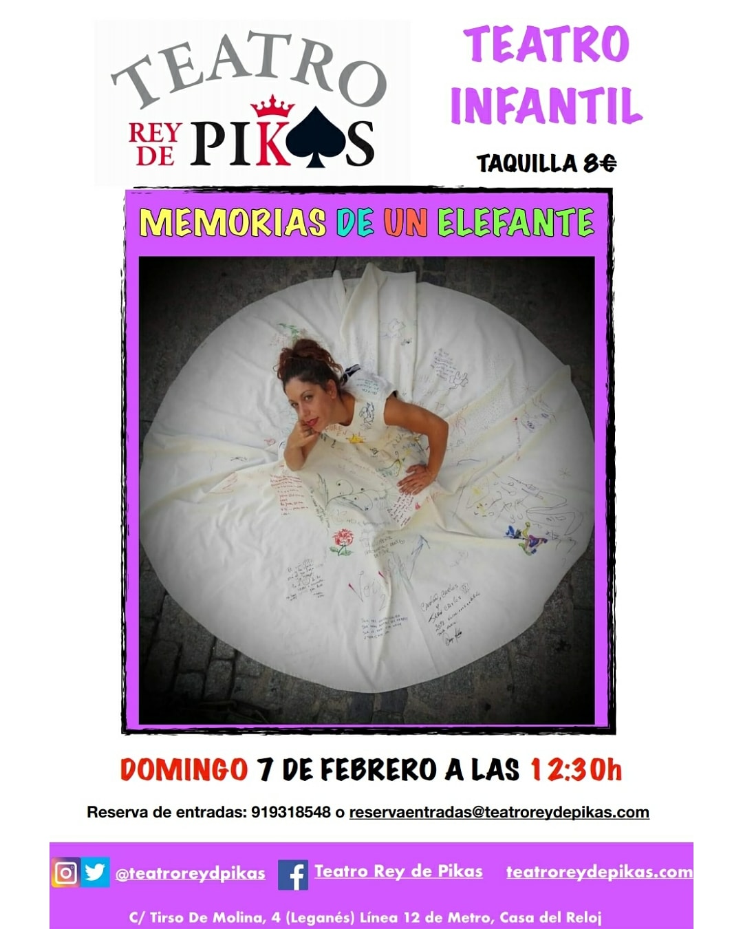 Por otro lado, el Teatro Rey de Pikas acoge el domingo 7, a las 12:30 horas la obra de teatro infantil ‘Memorias de un elefante’ de la mano de Rocío, de @alquimiacircus, lo que nos asegura un éxito asegurado por lo bien que cuenta las historias.