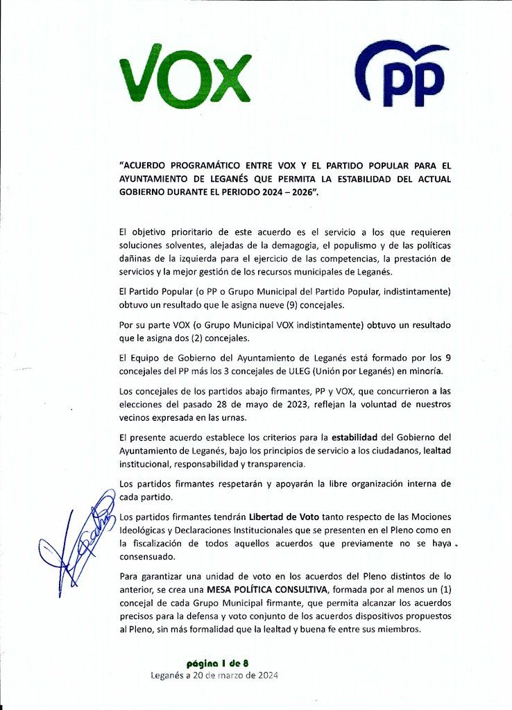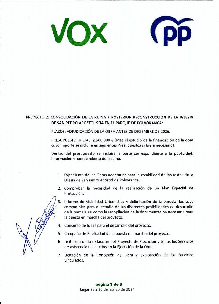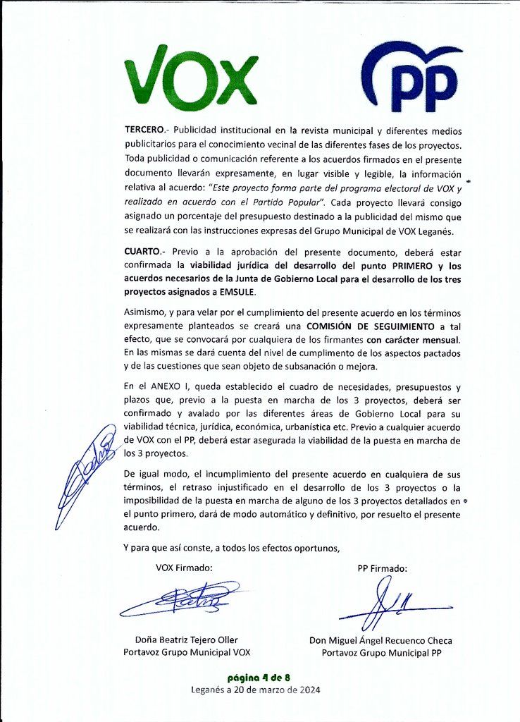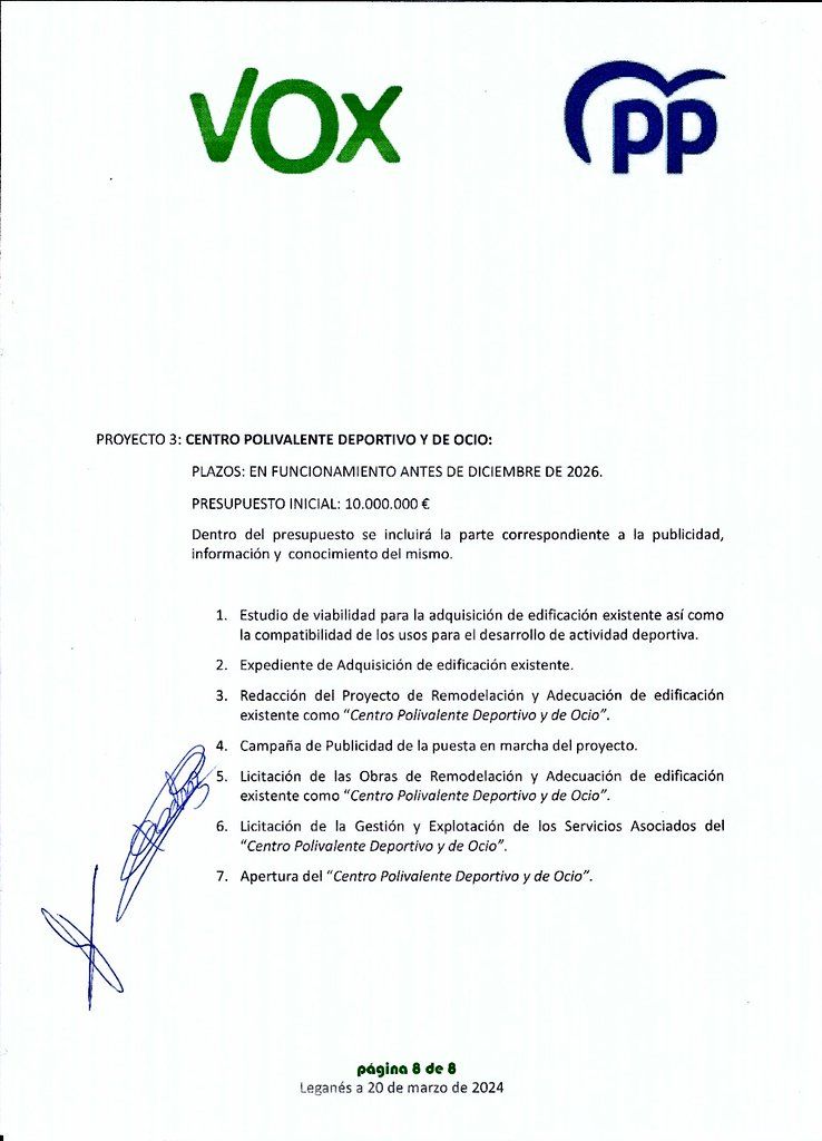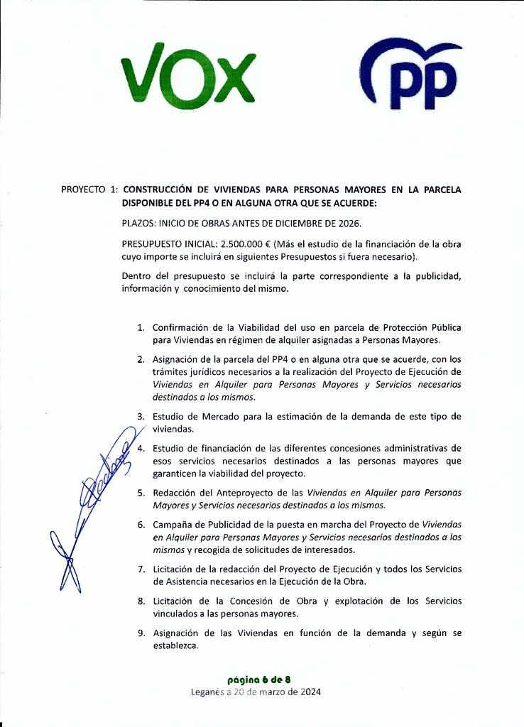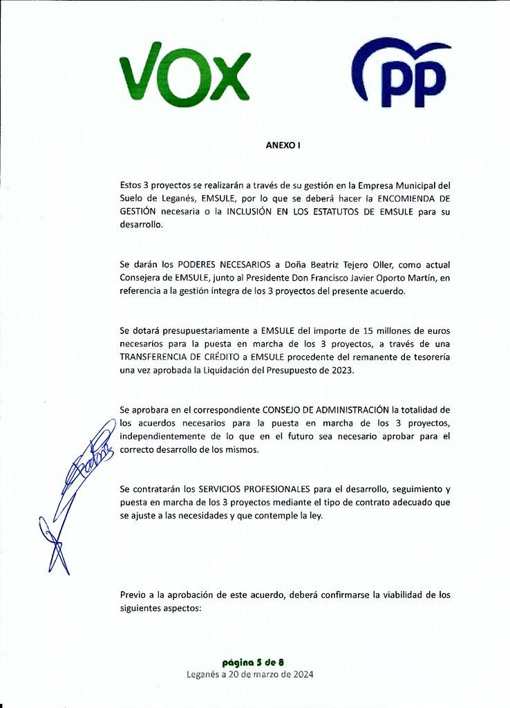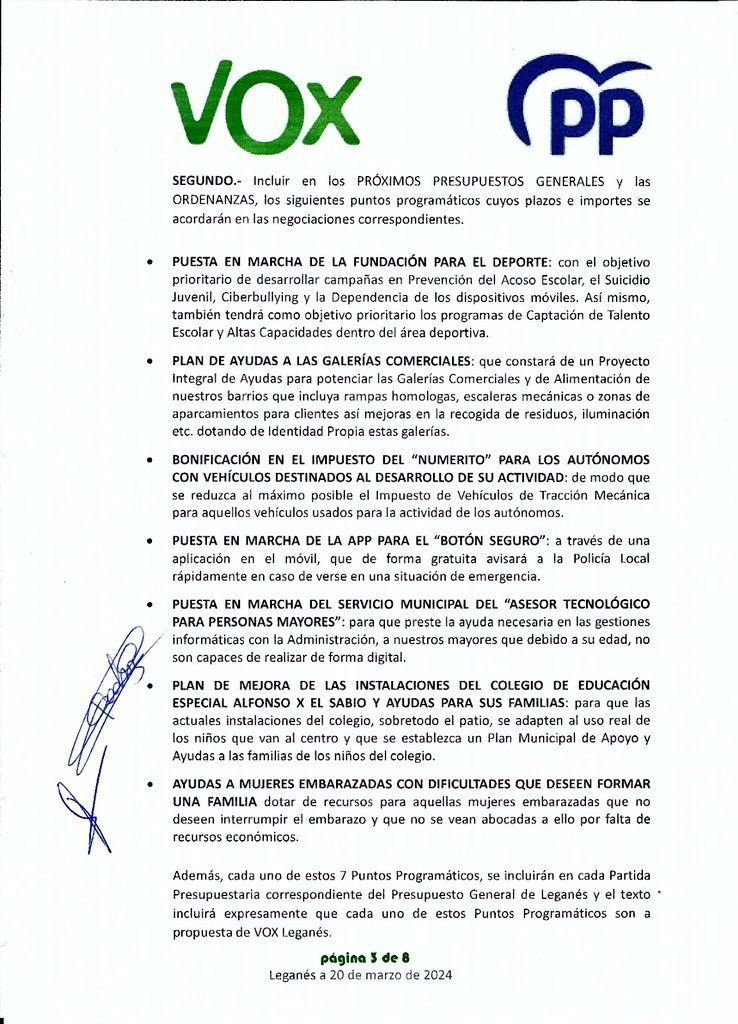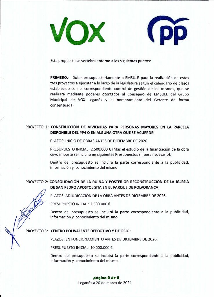 Este acuerdo tiene un coste, que se materializaría en determinadas inversiones para el municipio y que se fija en el propio documento. Vox ha exigido la realización de tres grandes proyectos que se deberían gestionar a través de la Empresa Municipal del Suelo de Leganés (EMSULE). Estos planes necesitarían una inversión de 15 millones de euros y se destinaría a la construcción de viviendas para personas mayores, a la recuperación y reconstrucción de la Iglesia de Polvoranca y en la construcción de un centro polivalente deportivo y de ocio.