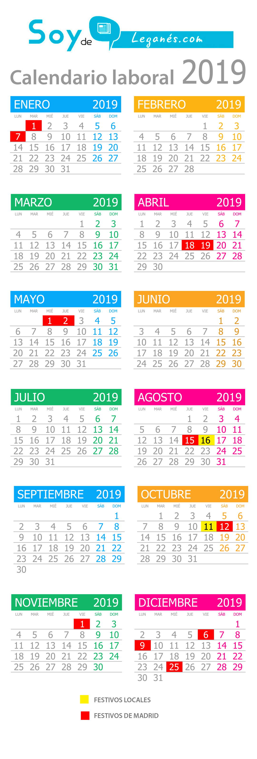 Hace unos días ya teníamos disponible el Calendario Laboral de la Comunidad de Madrid, y ahora ya disponemos de todos los días festivos de Leganés de 2019. Os hemos realizado un único calendario con todos los días de fiesta y puentes que tendrías en Leganés.