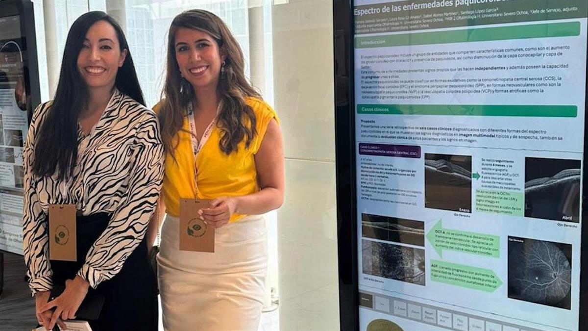 El Servicio de Oftalmología del Hospital Universitario Severo Ochoa ha recibido en este congreso de la SEO el tercer premio a la mejor comunicación en panel por el trabajo “Espectro paquicoroideo: serie de casos”. Las especialistas en Oftalmología, Famara Doblado y Laura Rosa Gil. han destacado en su trabajo cómo estas enfermedades del espectro paquicoroideo engloban un amplio grupo de entidades que se caracterizan por un engrosamiento de los grandes vasos coroideos y que pueden manifestarse tanto como formas exudativas, formas neovasculares o formas tróficas.