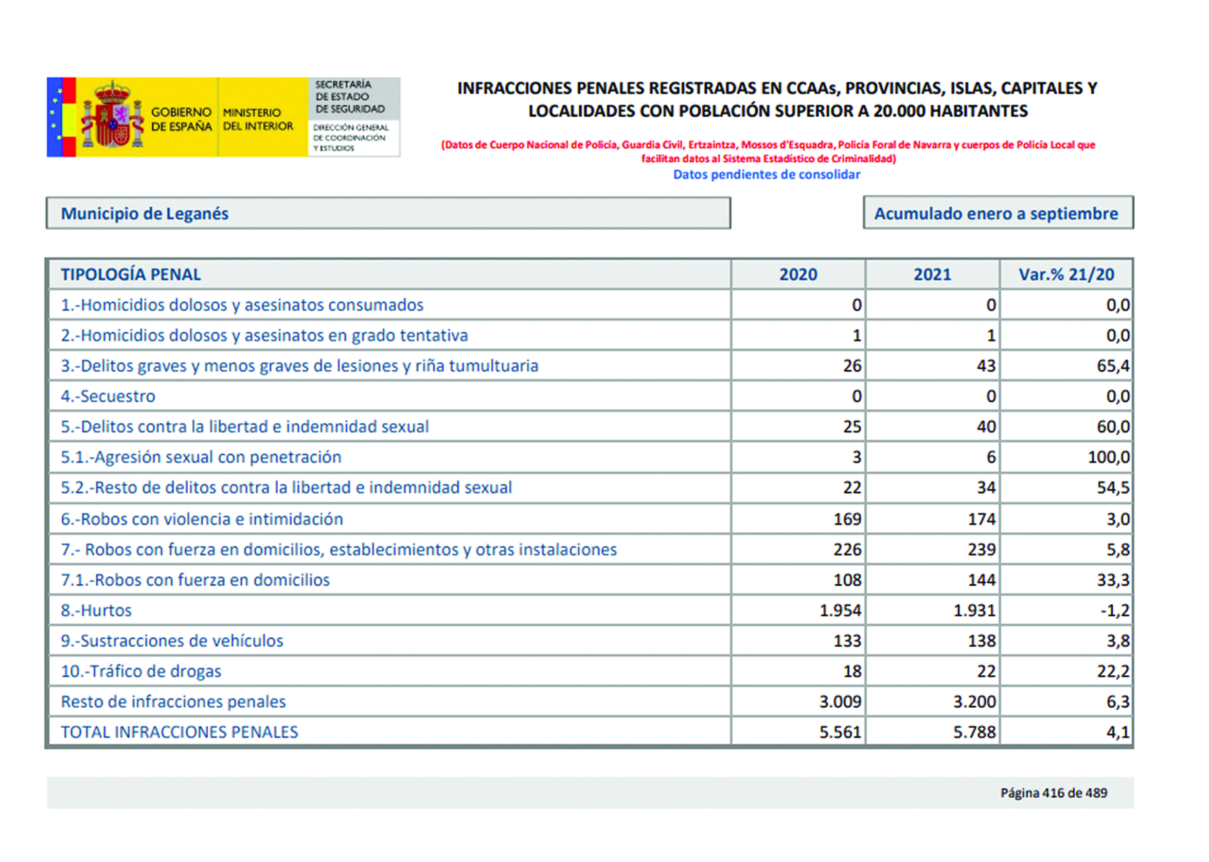 Datos de criminalidad en Leganés. Fuente: Ministerio del Interior