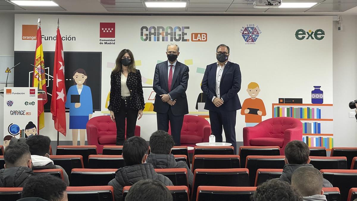 La Fundación Orange y el Instituto de Educación Secundaria Luis Vives han inaugurado hoy un nuevo centro GarageLab, el décimo de la Comunidad de Madrid, en un acto que ha contado con la presencia del consejero de Educación, Universidades y Ciencia y portavoz del Gobierno de la Comunidad de Madrid, Enrique Ossorio; y la directora general Regulación, Asuntos Públicos y Sostenibilidad de Orange, Luz Usamentiaga; todos ellos acompañados por el director del IES Luis Vives, Juan Carlos Morales.