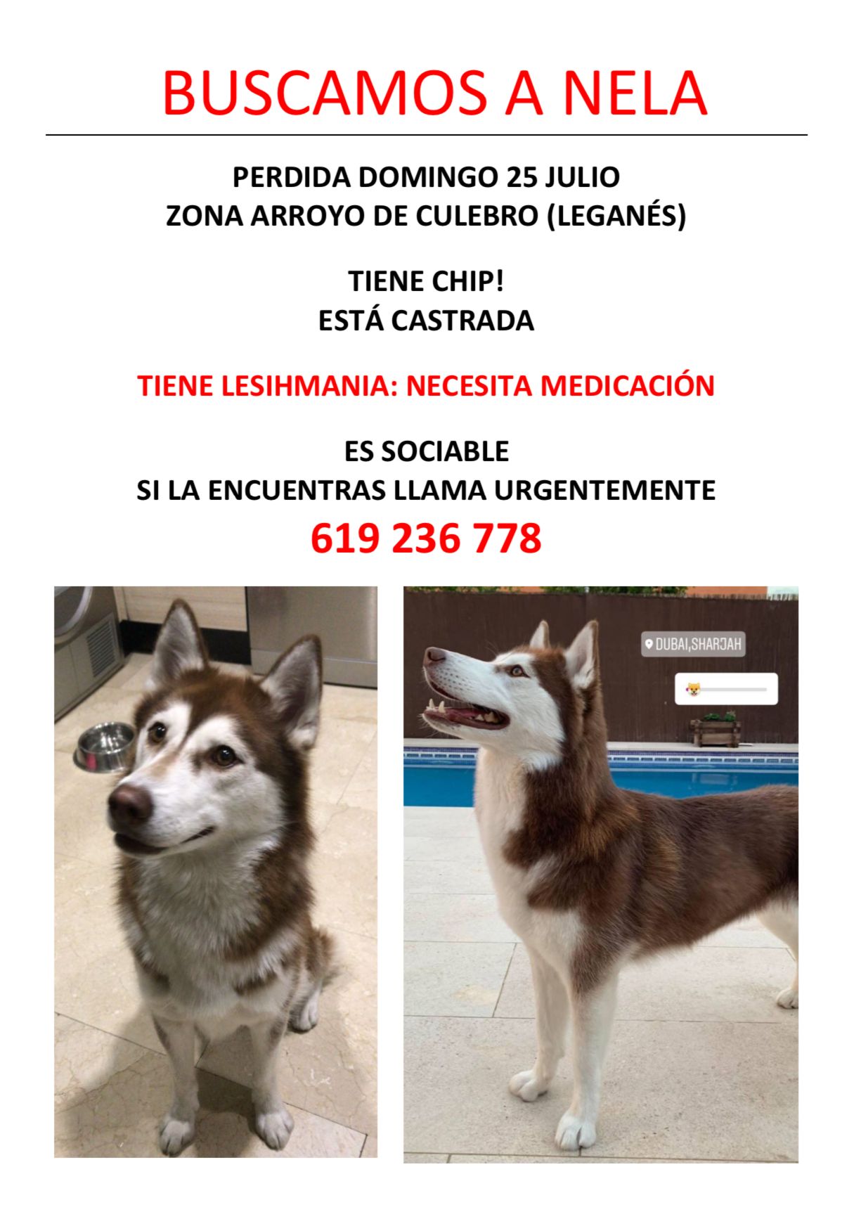 Tal y como pone en su cartel de búsqueda, Nela tiene chip y está castrada. Es una perrita muy sociable y necesita que la encontremos pronto porque tiene leishmania y necesita medicación. Si la encuentras o tienes alguna pista de dónde se puede encontrar, llama urgentemente al 619 236 778