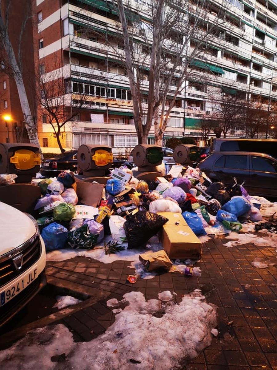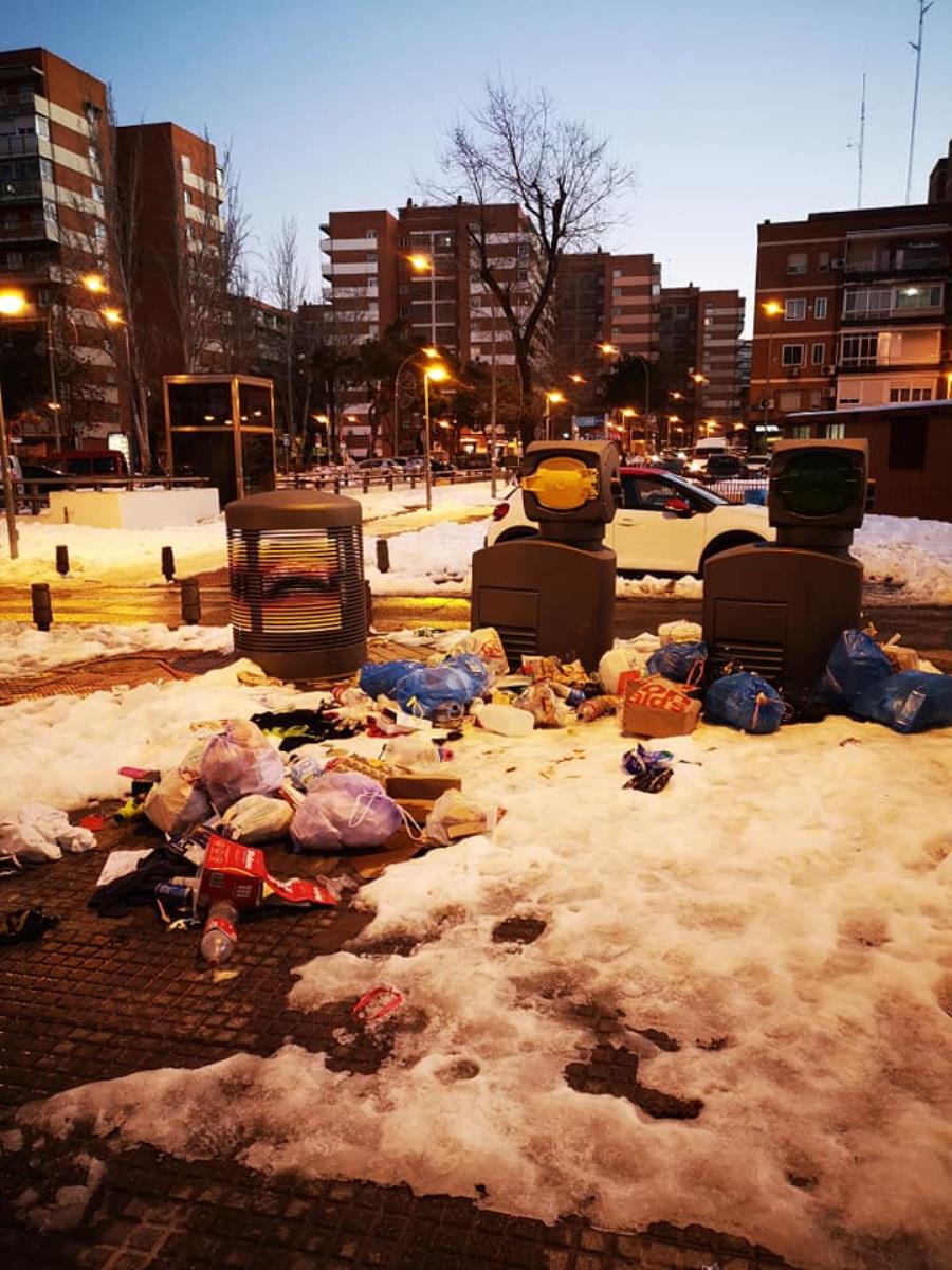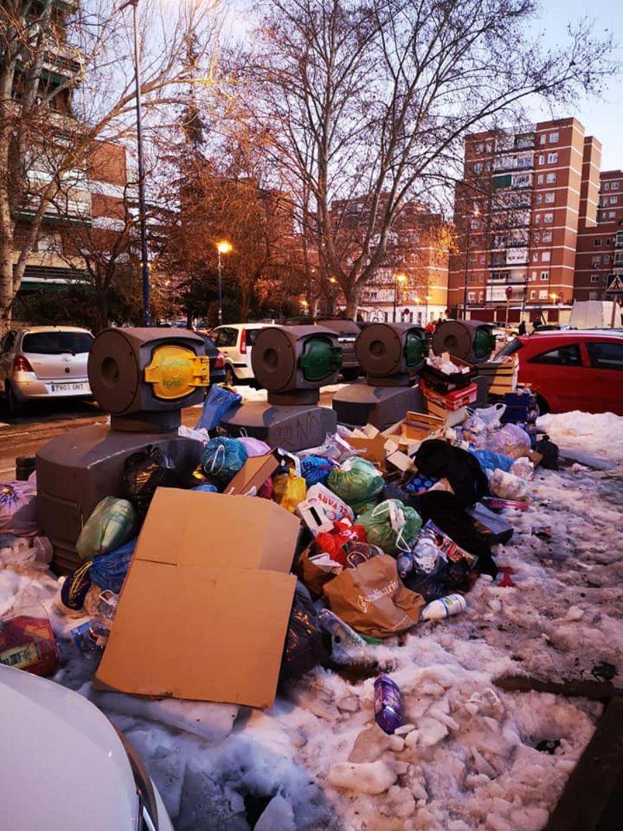 Después de más de 10 días de que se produjese la nevada, aún quedan calles cortadas, como es el caso de Zarzaquemada. La dificultad para moverse los vehículos no solo la han sufrido vecinos y máquinas quitanieves, sino también el camión de la basura, acumulándose en los contenedores y aledaños gran cantidad de suciedad.
