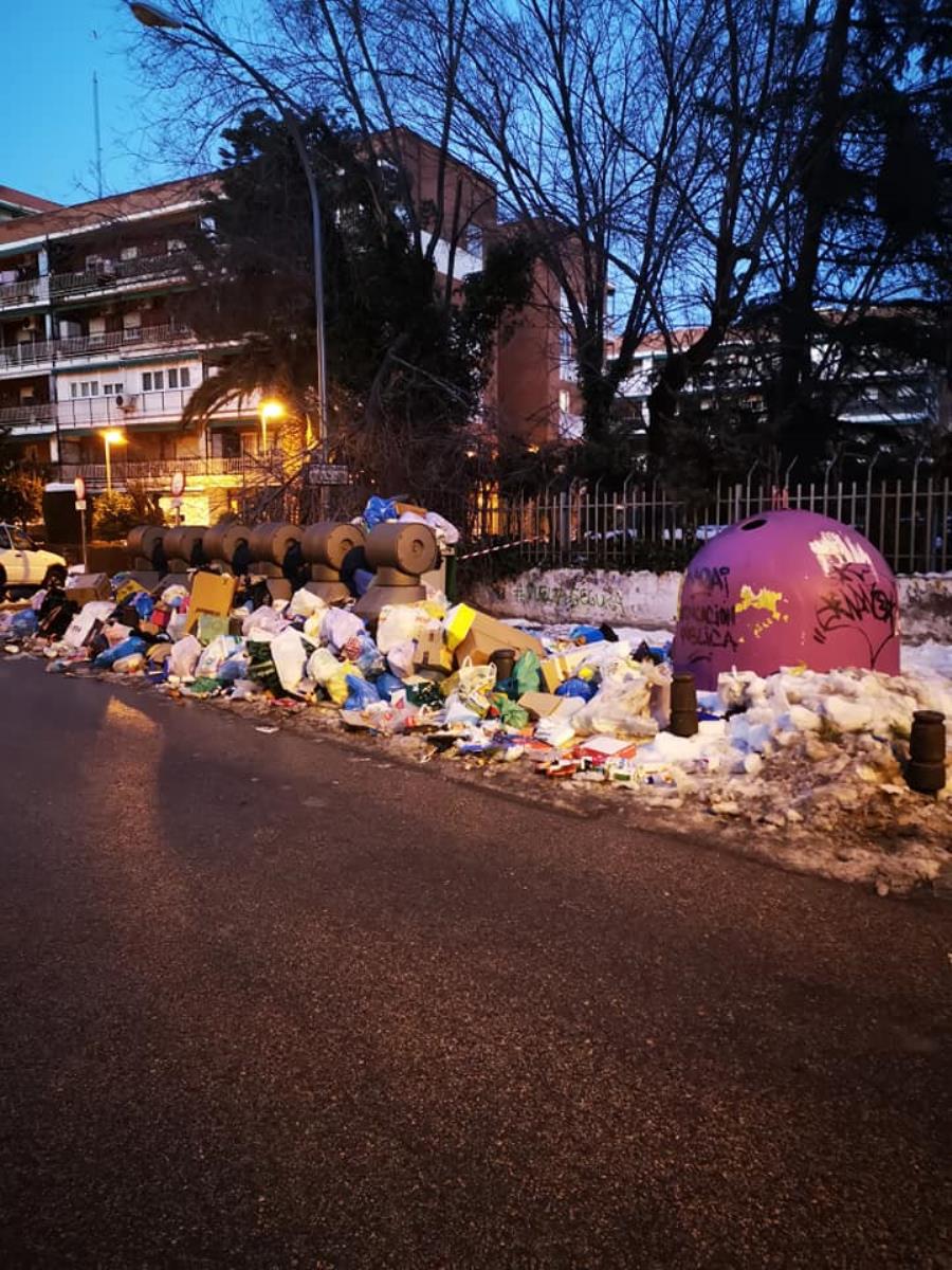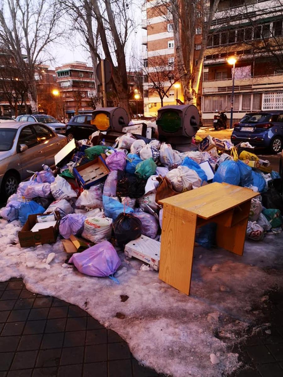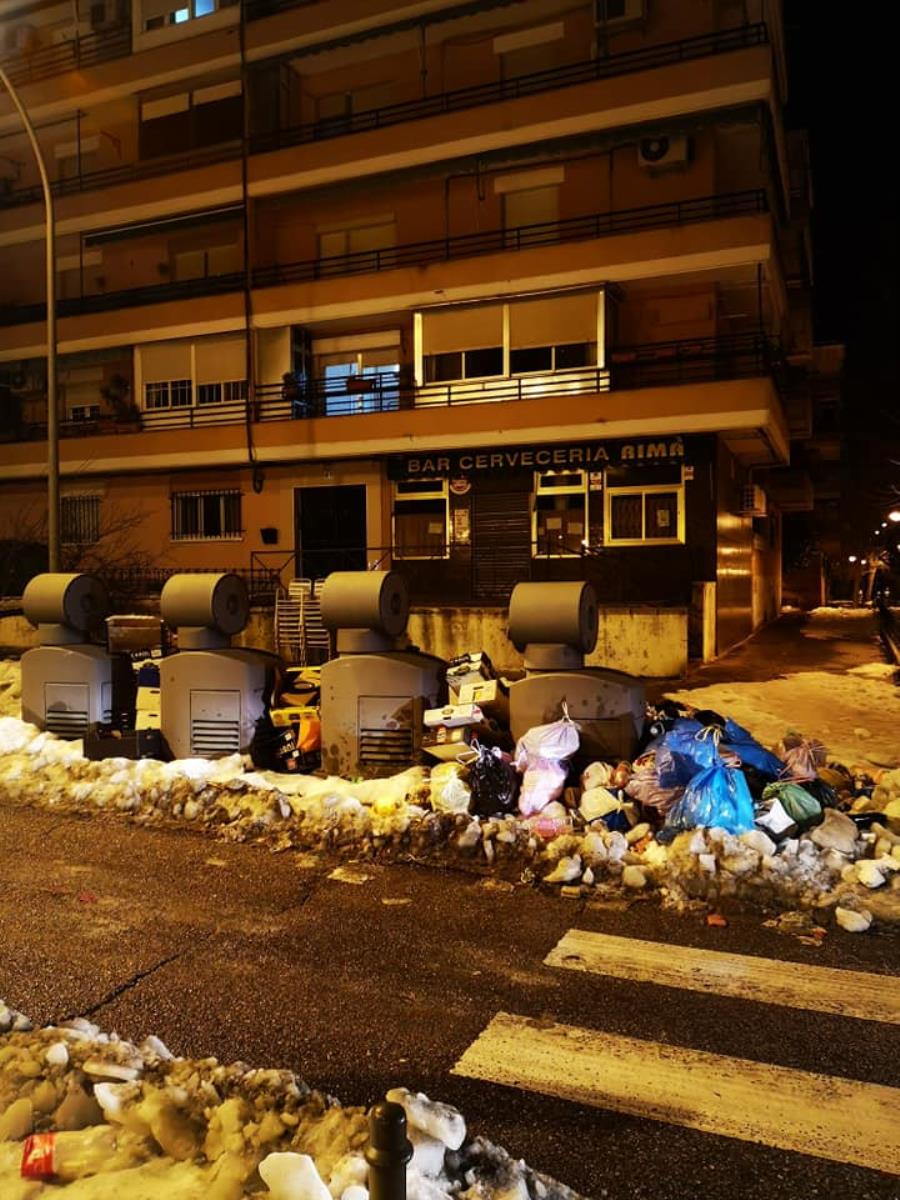 Después de más de 10 días de que se produjese la nevada, aún quedan calles cortadas, como es el caso de Zarzaquemada. La dificultad para moverse los vehículos no solo la han sufrido vecinos y máquinas quitanieves, sino también el camión de la basura, acumulándose en los contenedores y aledaños gran cantidad de suciedad.
