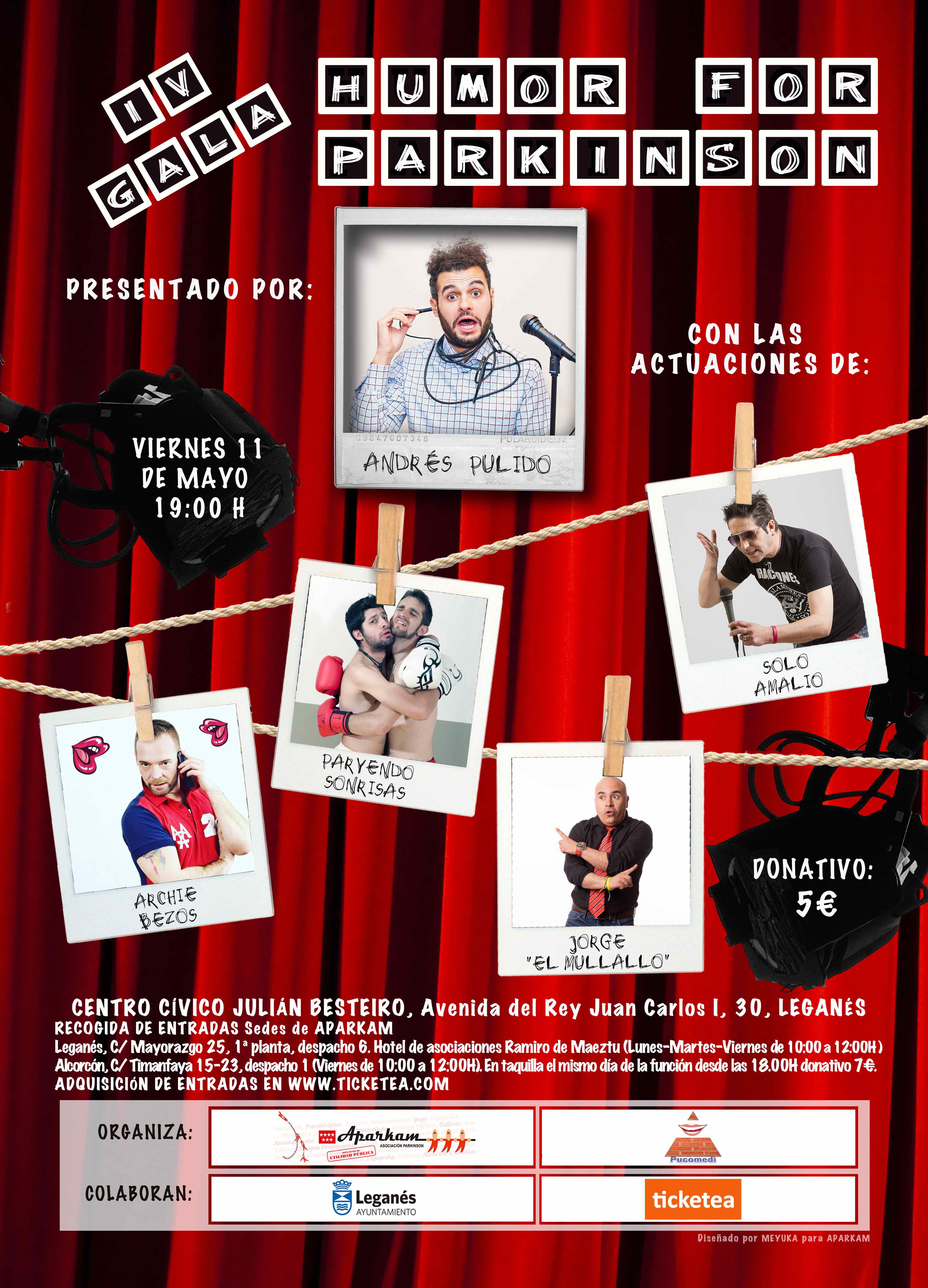 La Asociación Párkinson Aparkam ha organizado este viernes 11 de mayo, en el Centro Cívico Besteiro de Leganés una gala solidaria en la que se contará con la actuación de monologistas. La gala, con el título IV Gala Humor For Párkinson está destinada a recaudar fondos que se inviertan de manera íntegra a financiar servicios interdisciplinares que ofrecen para personas con Párkinson y sus familiares. La entrada-donativo tiene un coste de 5 € por persona.