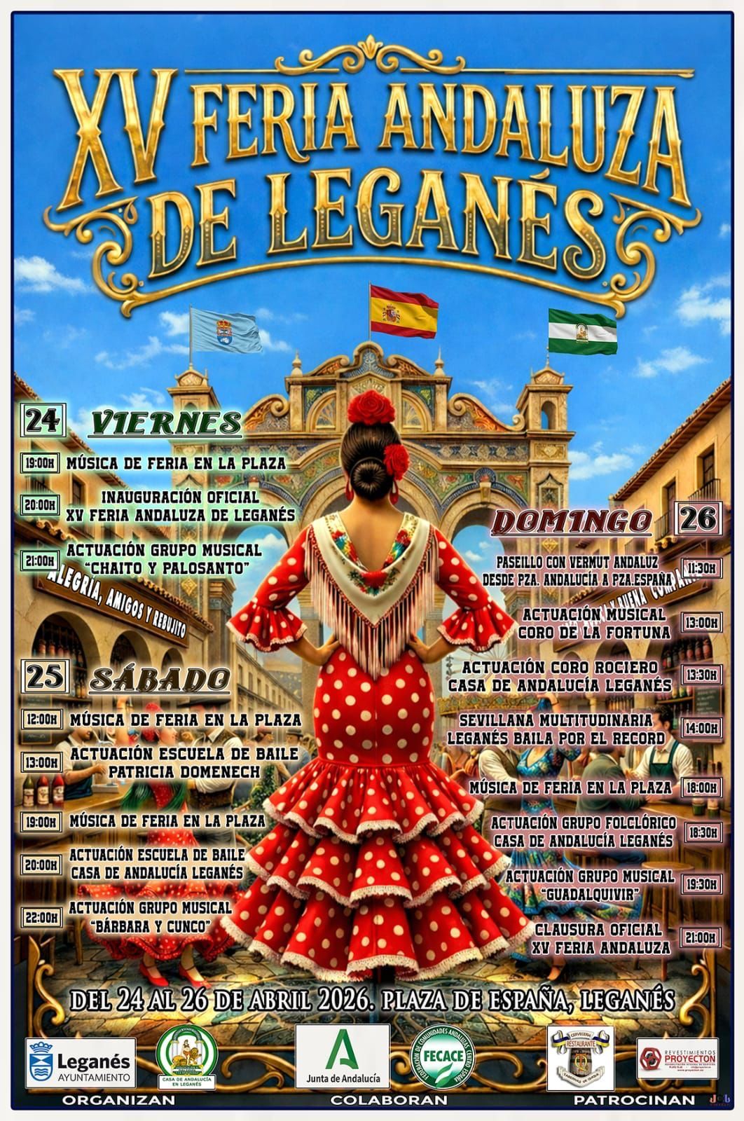 Leganés volverá a llenarse de música, color y tradición con la celebración de la XV Feria Andaluza, que tendrá lugar del 24 al 26 de abril en la Plaza de España. El Ayuntamiento y la Casa de Andalucía organizan por tercer año consecutivo esta cita festiva, convertida ya en uno de los eventos más queridos del calendario local.
