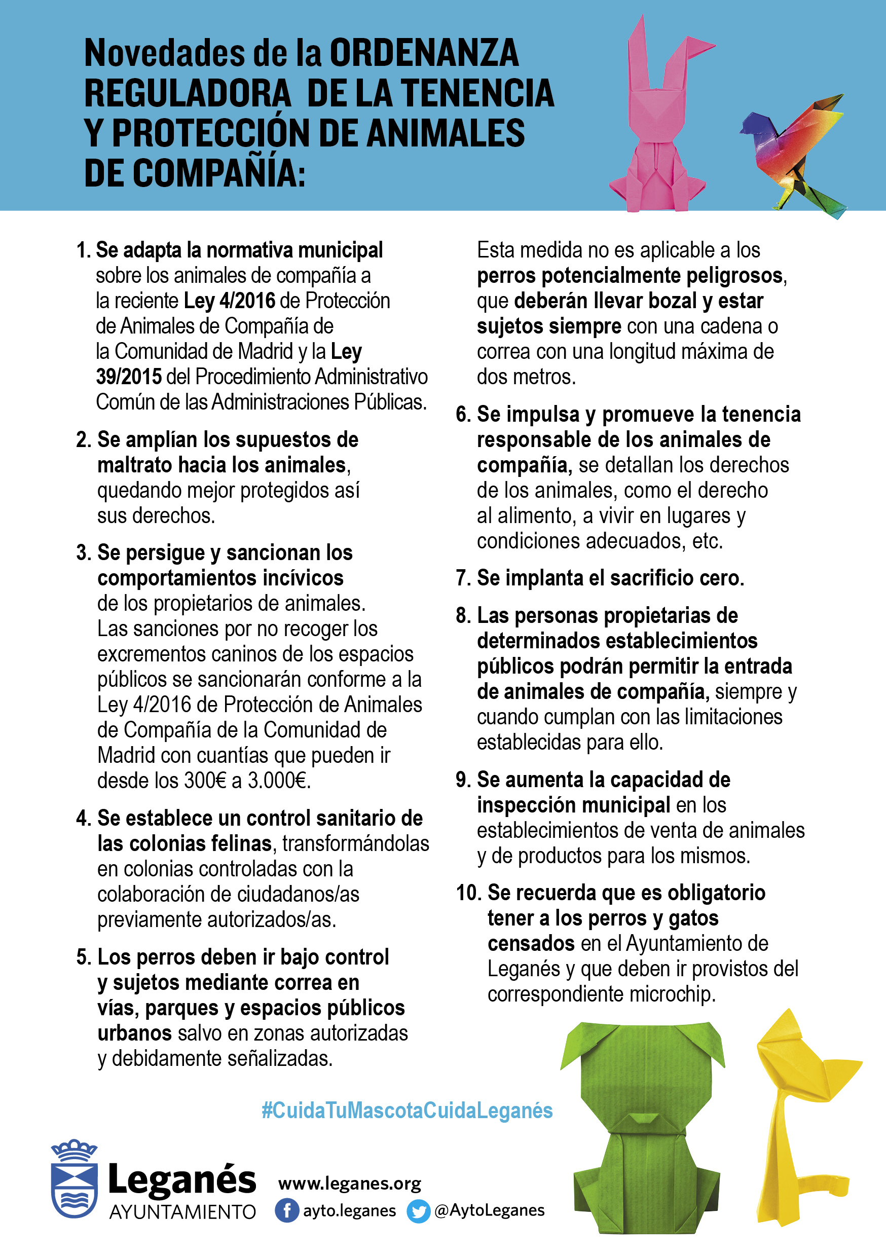 Para dar a conocer esta ordenanza, el consistorio leganense ha lanzado la campaña ‘Cuidar tu mascota es cuidar Leganés’, además del hashtag #CuidaTuMascotaCuidaLeganés.