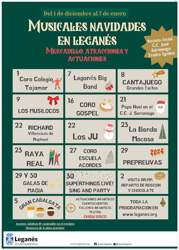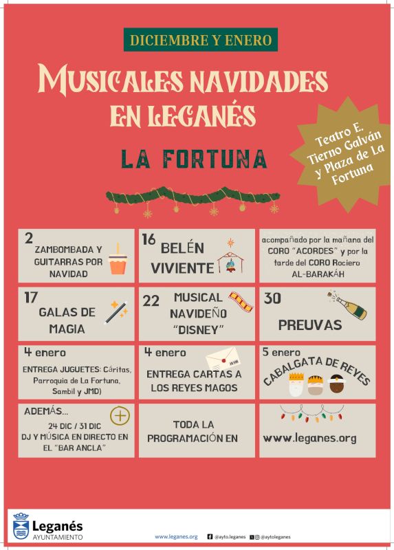 Habrá galas de magia en el Teatro Tierno Galván (domingo 17, 11:00 y 12:45 horas); musicales de canciones navideñas y de Disney (viernes 22, 18:00 y 20:00 horas); y el sábado 30 de 20:00 a 2:30 horas se celebrarán las preuvas en la Plaza de La Fortuna, con un concierto tributo a Alejandro Sanz, DJ y cotillón.