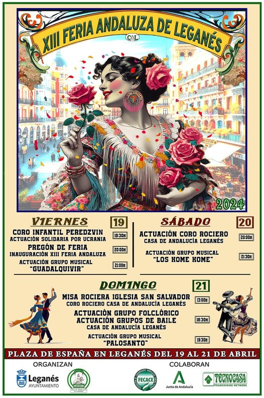 El fin de semana del 19 al 21 de abril en lo referente a los planes de ocio de Leganés está marcado por el arranque de la Feria Andaluza, que continuará el próximo fin de semana en La Fortuna. Una actividad que se llevará a cabo en la Plaza de España, recuperada tras cinco años sin celebrarse, con la colaboración de la Casa de Andalucía de Leganés. Además, el equipo femenino del Baloncesto Leganés disputa su primer partido de cuartos de final en el Pabellón Carlos Sastre, ya que en el Pabellón Europa se celebra el XXV Trofeo Villa de Leganés de gimnasia rítmica. Y Javier Gutiérrez y Luis Bermejo dan vida a la obra “El Traje”, en una de las cuatro citas de “A Escena”, dos de las cuales son eventos musicales: “Alma Mía” (Boleros) y “B-Vocal”.