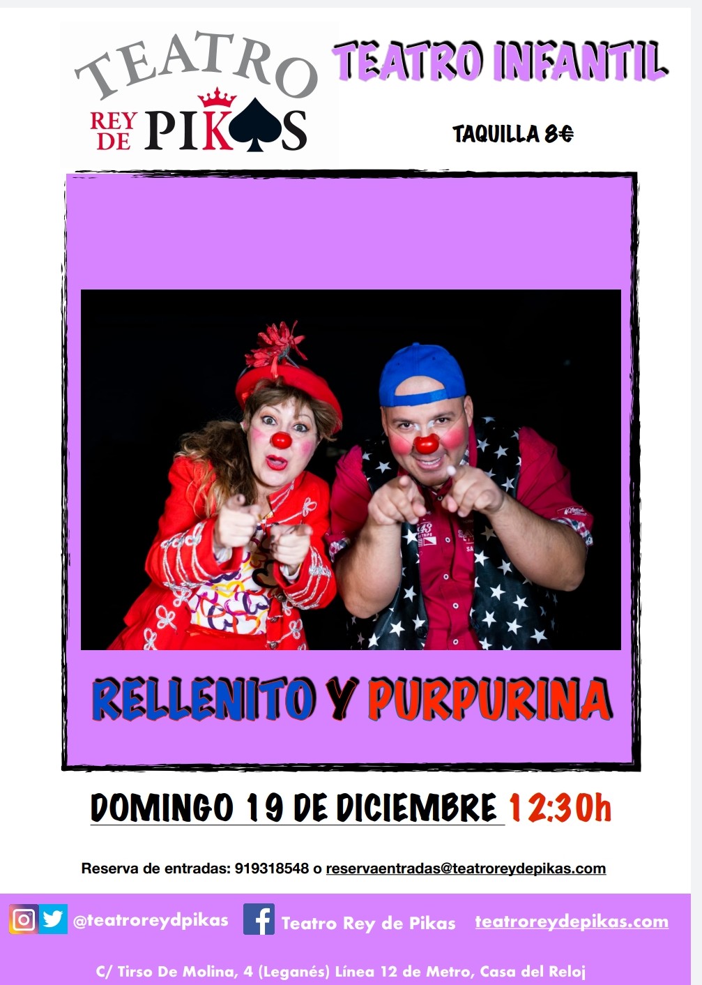 El segundo espectáculo que ofrece el Teatro Rey de Pikas es el de Animación infantil con Rellenito y Purprurina el domingo 19 a las 12:30h: Un espectáculo guiado por 2 payasos con muchas ganas de divertirse y compartir con el público sus hazañas. "Cantaremos, bailaremos y jugaremos con ellos. Una hora de diversión para un público infantil/familiar", asegura el teatro.