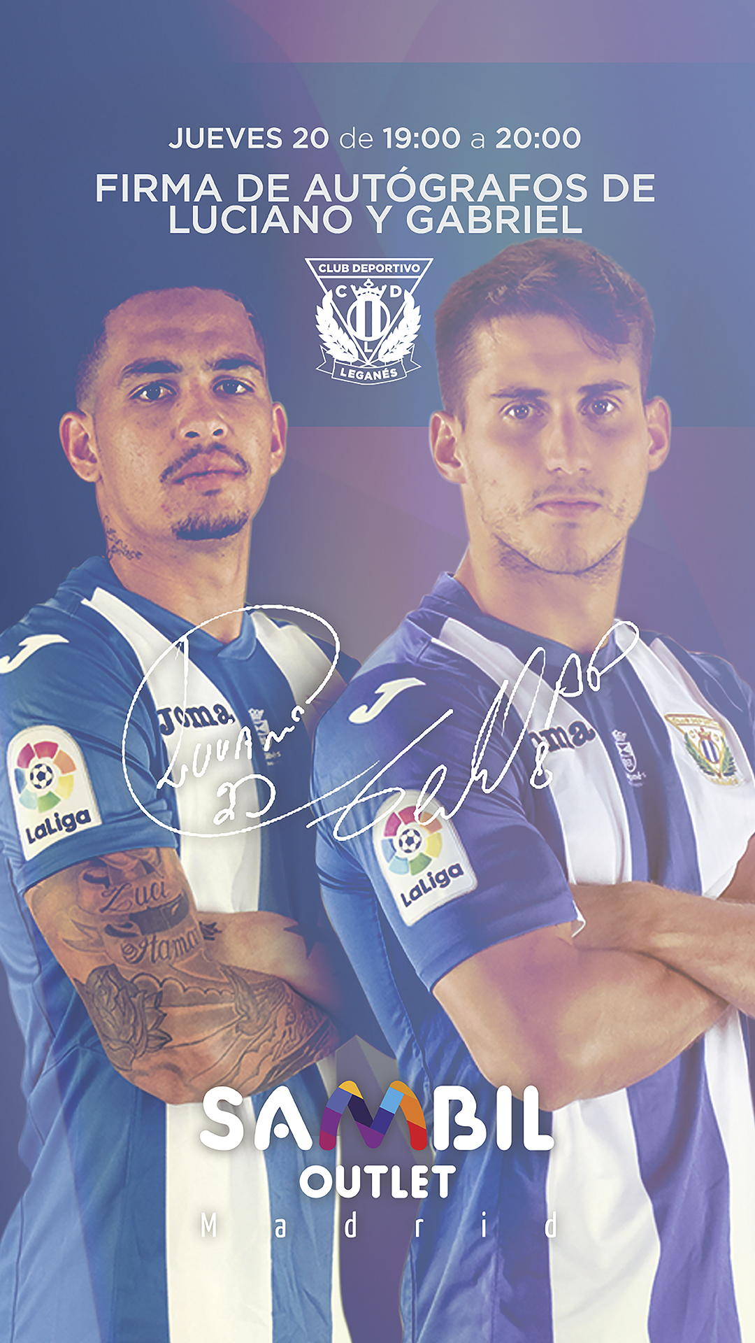 Los jugadores de Club Deportivo Leganés, Luciano Neves y Gabriel Pirés, realizarán esta tarde de 19:00h a 20:00h una firma de autógrafos en el centro comercial Sambil Outlet Madrid.
