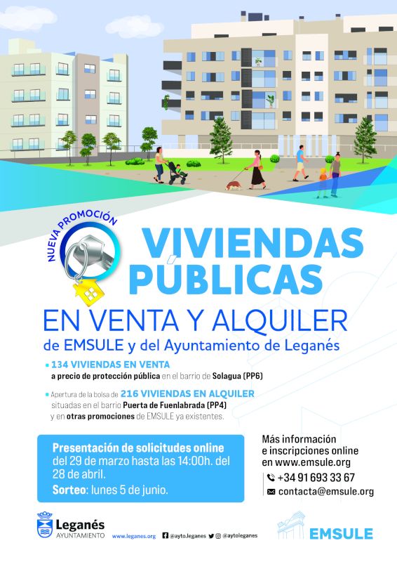 La Empresa Municipal del Suelo de Leganés (EMSULE) ha presentado una nueva promoción con 350 viviendas públicas en venta y alquiler para nuestra ciudad. En concreto, se pondrán a la venta 134 viviendas públicas en el barrio de Solagua (PP6) y se abrirá la bolsa para optar a 216 viviendas en régimen de alquiler tanto en el barrio Puerta de Fuenlabrada (PP4) como en otras promociones ya existentes de EMSULE.