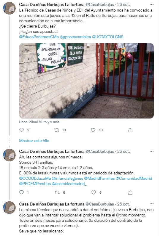 En este momento, según fuentes cercanas a las familias de dicho centro educativo, el cierre sería sobrevenido a la finalización del contrato de una de las dos educadoras que  hay en el centro. Dicho contrato pertenece a la tipología de los de fomento del empleo, publicitados hace meses por el Ayuntamiento de Leganés. Esta clase de acuerdos, una vez que llegan a su término no son renovables.