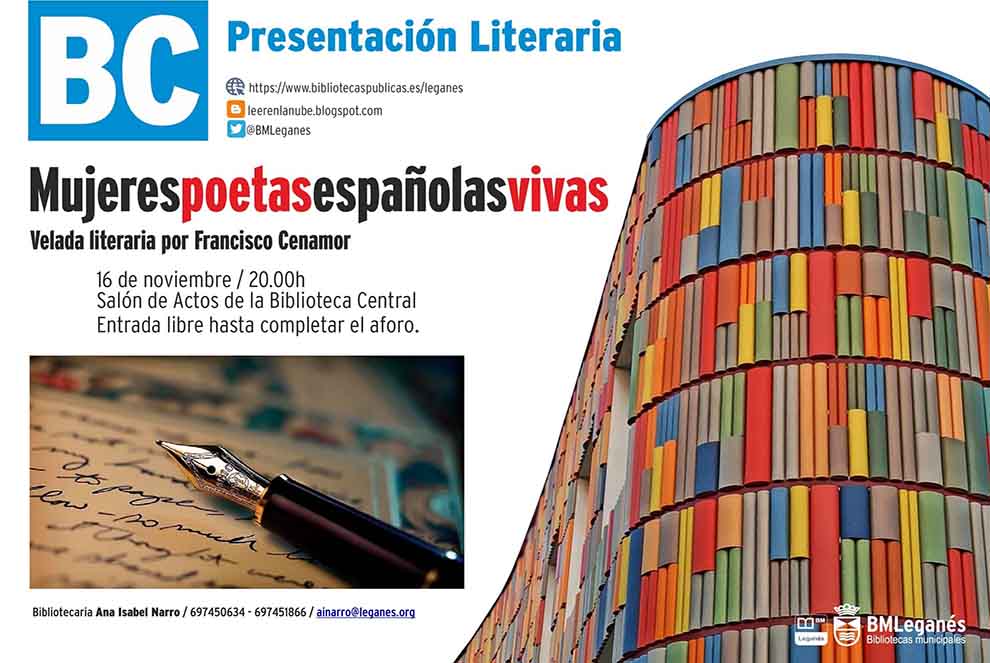 El próximo martes día 16 a las 20:00h, el salón de actos de la Biblioteca Central de Leganés, acogerá la presentación literaria Mujeres poetas españolas vivas. Esta velada literaria será presentada por el creador local Francisco Cenamor.