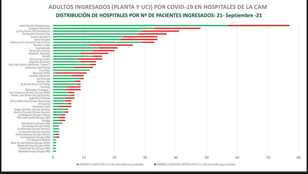Mientras, en el Hospital Severo Ochoa la caída del número de pacientes ingresados también es notoria. Según la cuenta de Twitter en la que médicos de todos los hospitales de Madrid comparten los datos, en el día de ayer eran 4 las personas ingresadas en planta y tres en la UCI. Siete, por tanto, los ingresados con COVID.