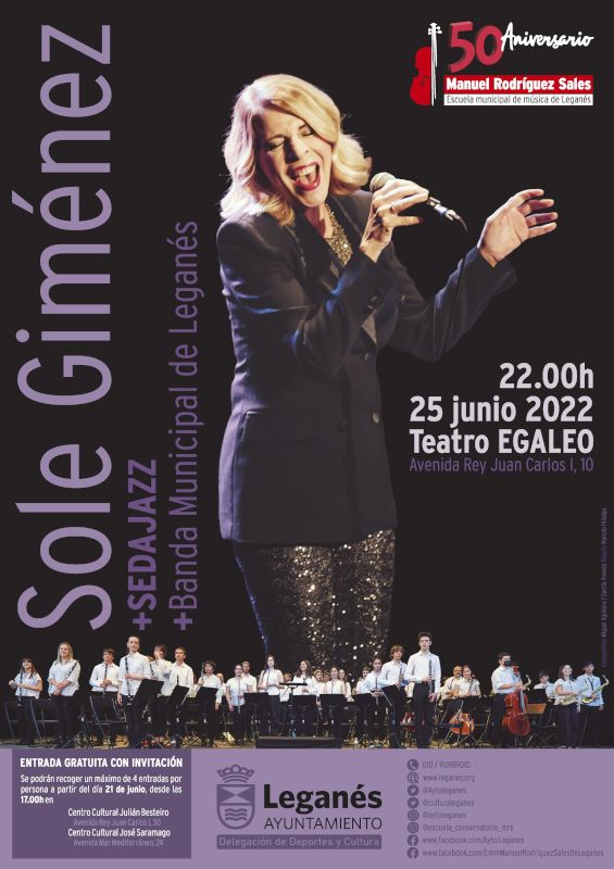 En la misma jornada, Sole Giménez actuará junto a Seda Jazz y la Banda Municipal de Música de Leganés en el concierto especial 50 aniversario de la Escuela de Música Manuel Rodríguez Sales. Se trata de un proyecto diferente que dará una nota de color a la celebración del 50 aniversario.