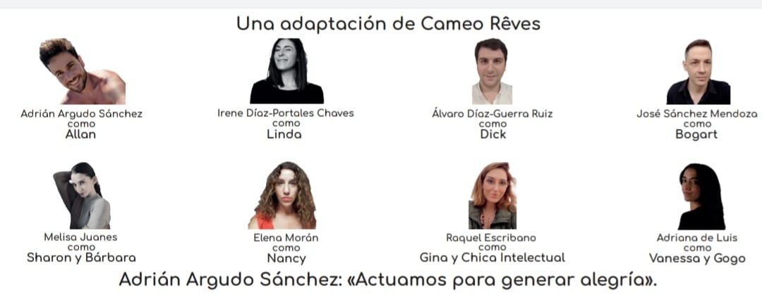 Los actores cuentan, en su mayoría, con un elenco formado en el Grupo de Teatro de la Universidad Carlos III de Madrid, alma máter de siete de los ocho integrantes. Así, el reparto lo completan Adrián Argudo Sánchez, Irene Díaz-Portales Chaves, Álvaro Díaz-Guerra Ruiz, Melisa Juanes, Elena Morán, Raquel Escribano, Adriana de Luis y José Sánchez. El propio Adrián ha declarado que “esta compañía actúa para generar alegría. Nos motiva mucho aportar un granito solidario a través del arte”.
