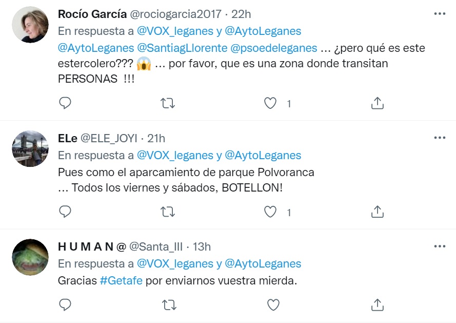 No solo la formación política ha mostrado su indignación, los vecinos de Leganés tampoco han tardado en hacerlo a través de las respuestas al tuit de la denuncia.