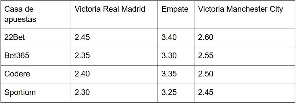 Para demostrarlo, veamos un ejemplo práctico de comparación de cuotas en un partido de la Champions League entre el Real Madrid y el Manchester City: