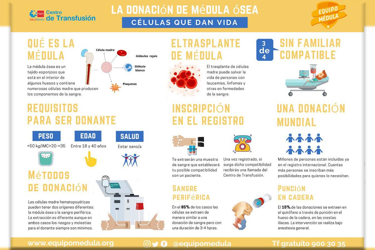 El registro español es REDMO. En Madrid, los hospitales clave para la donación de médula son: La Paz, Doce de Octubre, Fundación Jiménez Díaz, La Princesa, Clínico San Carlos, Gregorio Marañón y el Ramón y Cajal.