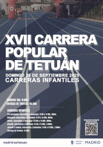 El domingo 28, las calles del distrito volverán a llenarse de corredores en la XVII Carrera Popular de Tetuán, con un recorrido por la calle de Bravo Murillo. La cita comenzará a las 9:00 horas con la prueba de 10 kilómetros y continuará con carreras infantiles adaptadas a cada categoría, desde prebenjamín hasta juvenil y cadete. La entrega de trofeos tendrá lugar a las 10:30 h para los adultos y a las 12:00 h para las categorías infantiles. Es necesario haberse inscrito de manera online y recoger el dorsal.