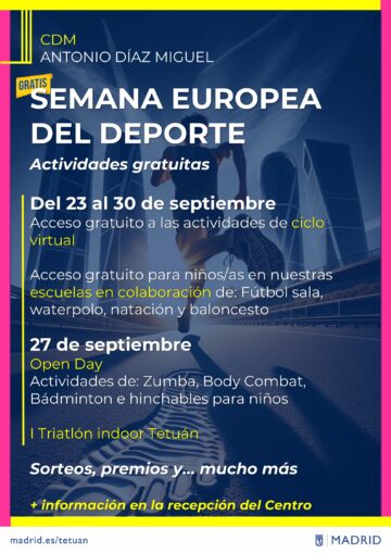 Del 23 al 30 de septiembre, también habrá acceso gratuito a actividades deportivas en el Centro Deportivo Municipal Antonio Díaz Miguel. Se realizarán sesiones de ciclo virtual, fútbol sala, waterpolo, judo, natación y baloncesto para los más pequeños. Además, el 27 de septiembre, tendrá lugar una jornada de puertas abiertas con zumba, body combat, bádminton e hinchables infantiles que, junto al I Triatlón Indoor Tetuán, completará una programación llena premios y sorpresas. Para participar es necesario apuntarse en la recepción del centro o en la aplicación Madrid Móvil en el caso de las actividades de zumba y body combat.