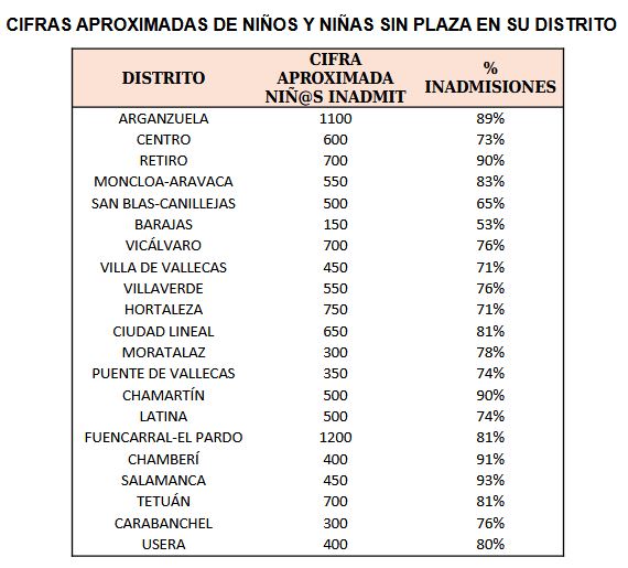De hecho, la edil socialista asegura que hay distritos donde “el porcentaje de inadmitidos supera el 80% y en cuatro de ellos supera el 90% ”. Sin embargo, parece ser que ante estos datos “el Ayuntamiento de Madrid sigue mirando hacia otro lado ”, puesto que la moción presentada en septiembre de 2024 por el Partido Socialista, y que recibió el apoyo de toda la oposición, tuvo el `no´ del equipo de Gobierno. Una propuesta en la que pedían elaborar un Plan Director de Escuelas Infantiles 2025-2030. El Partido Socialista ha presentado una tabla con las cifras aproximadas de niños sin plaza en su distrito: