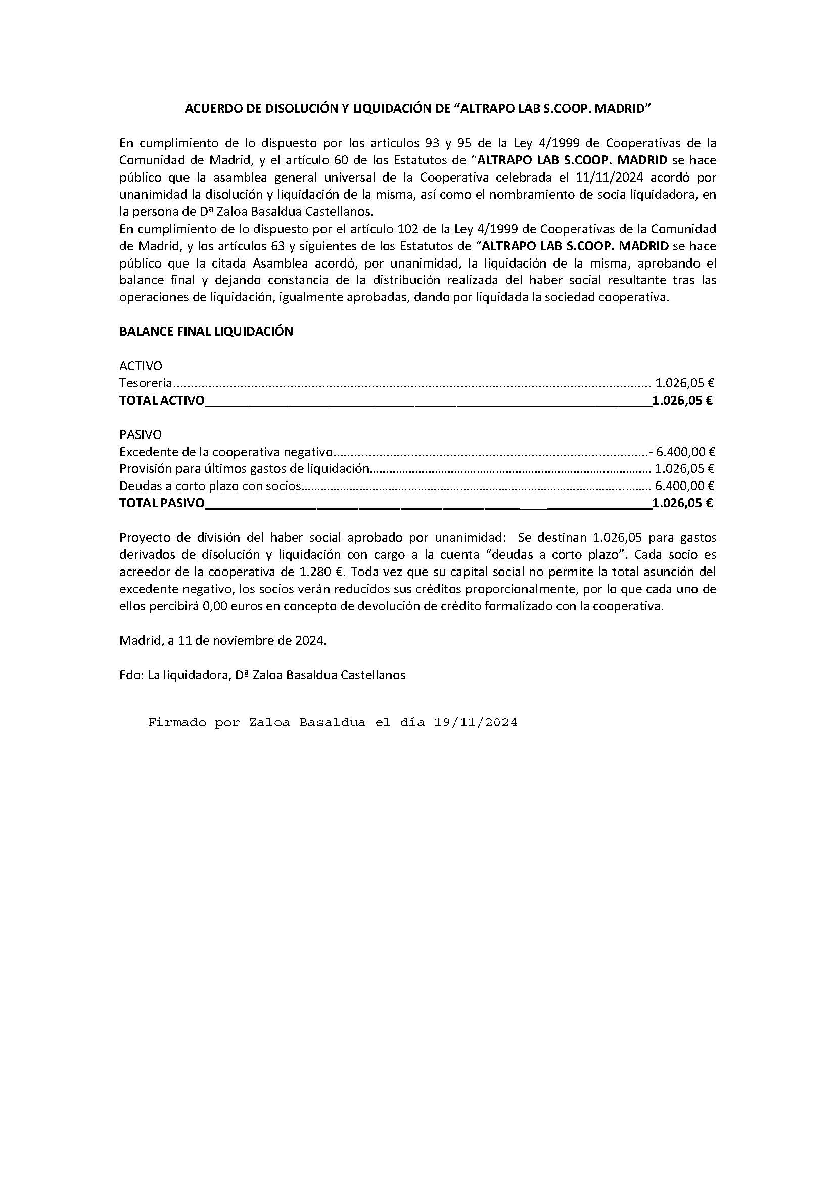 En cumplimiento de lo dispuesto por los artículos 93 y 95 de la Ley 4/1999 de Cooperativas de la Comunidad de Madrid, y el artículo 60 de los Estatutos de “ALTRAPO LAB S.COOP. MADRID se hace público que la asamblea general universal de la Cooperativa celebrada el 11/11/2024 acordó por unanimidad la disolución y liquidación de la misma, así como el nombramiento de socia liquidadora, en la persona de Dª Zaloa Basaldua Castellanos.