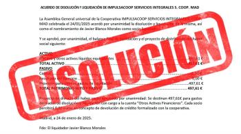 La Asamblea General universal de la Cooperativa ASOCLIMA ASOCIADOS DEL CLIMA S.COOP. MADRID”, celebrada el 24/01/2025 acordó por unanimidad la disolución y liquidación de la misma, así como el nombramiento de Paulino Palomares Rojas como socio liquidador. Y se aprobó, por unanimidad, el balance final de liquidación y el proyecto de distribución del haber social siguiente: