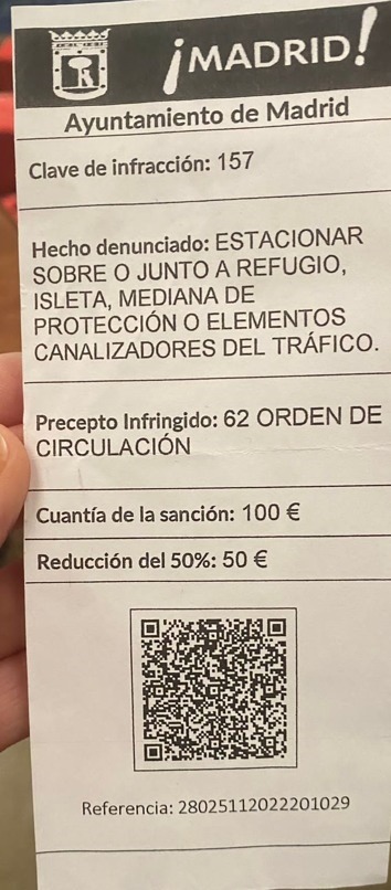 En la parte frontal, el papel muestra un logotipo del Ayuntamiento en el encabezamiento, una presunta clave de infracción, hecho denunciado, precepto infringido, cuantía de la sanción, el importe con la reducción por pronto pago, un código QR y una referencia. El código remite a la web de pago de sanciones de Ayuntamiento sin que el receptor pueda realizar el abono. La parte trasera está en blanco.
