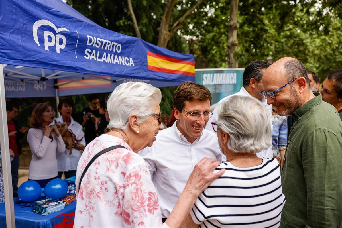 El candidato del Partido Popular a la alcaldía de Madrid, José Luis Martínez-Almeida, se ha comprometido a construir 60 nuevas áreas caninas en las zonas más demandas durante los próximos cuatro años, si revalida su cargo en el ayuntamiento. El popular ha hecho este anuncio durante la visita al parque Eva Duarte, acompañado por la presidenta de la fundación ‘Arca de Noé’, Alejandra Botto. Un recorrido al que también han asistido la directora de campaña, Inmaculada Sanz, el responsable del programa electoral, José Fernández, y el presidente del PP del distrito de Salamanca, Jorge Rodrigo.