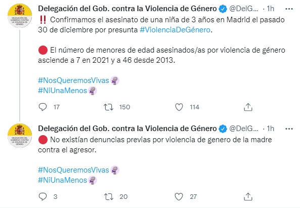 La Delegación del Gobierno ha confirmado el crimen como un caso de violencia machista. De este modo, el número de menores asesinados por violencia vicaria este año ascendería a siete (44 desde 2013, cuando se empezaron a recopilar datos).