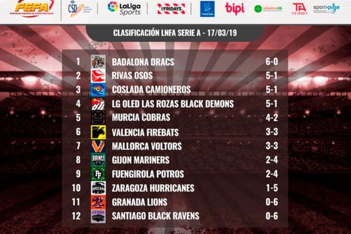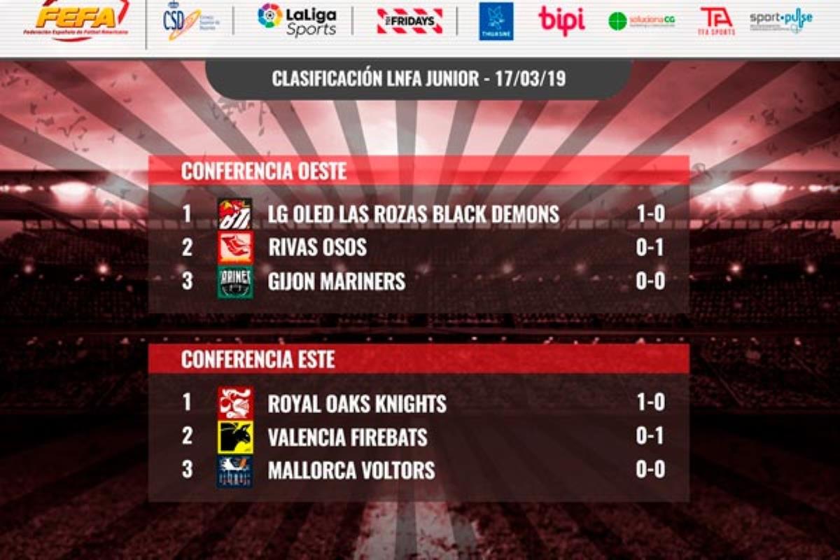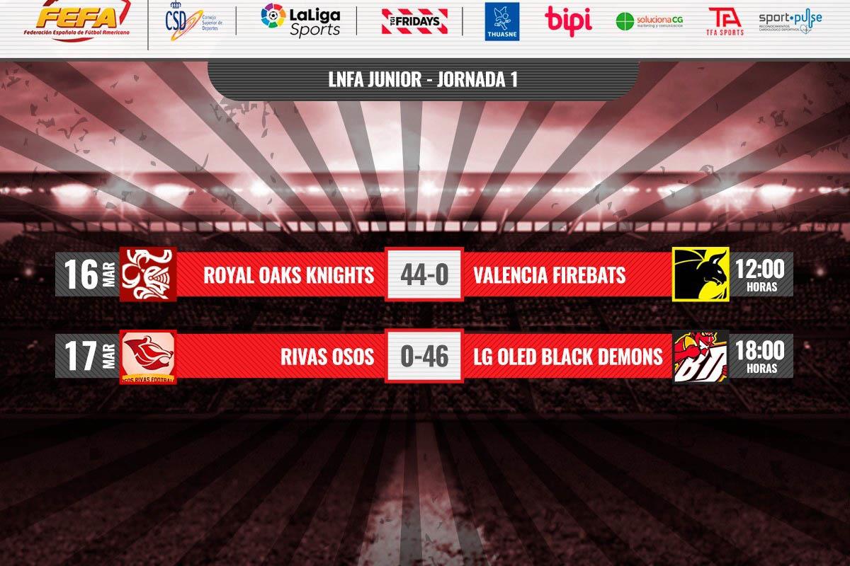 La LNFA Junior, por último, arrancó con victorias para Royal Oaks Kinghts (44-0 contra Valencia Firebats) y de los vigentes campeones, LG OLED Las Rozas Black Demons, que vencieron en feudo de Osos Rivas (0-46).