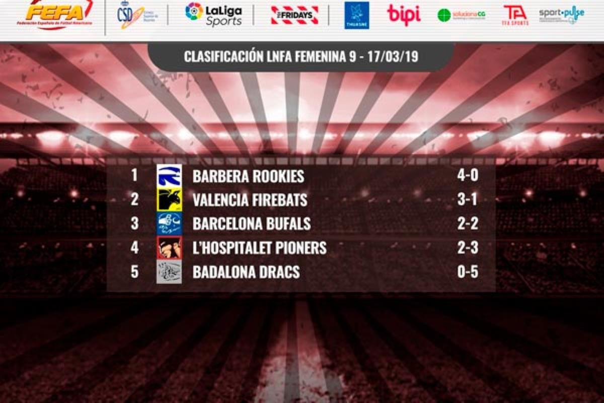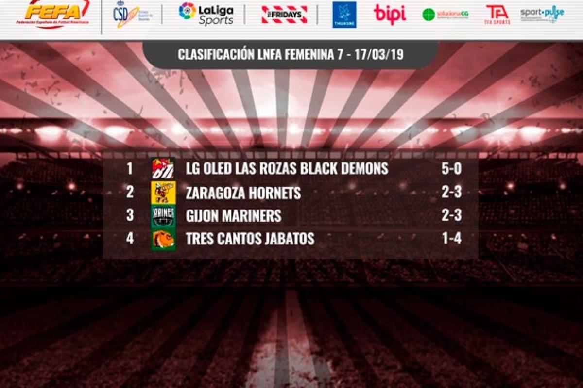 En la LNFA Femenina, triunfo claro de L'Hospitalet Pioners en feudo de Badalona Dracs (8-44), que le mantiene con opciones de intentar conseguir la segunda plaza que da acceso a la gran final. En la LNFA Femenina7x7, LG OLED Las Rozas Black Demons sumó una nueva victoria (6-34 en feudo de Gijón Mariners) y ya tiene asegurado el billete para la final. La otra plaza se la disputarán en la última jornada de la liga regular Gijón Mariners y Zaragoza Hornets. Las zaragozanas cayeron en casa de Jabatos Tres Cantos (33-28), que todavía no conocían el triunfo, y dejaron escapar la opción de asegurar matemáticamente la segunda posición de la tabla.