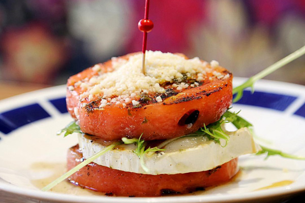 Sandía a la parrilla con queso de cabra, mizuna, hojas de mostaza y almendras