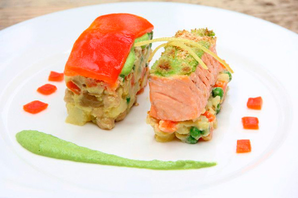 Salmón Sashimi en pan de espelta, crema de guisantes, menta y ralladura de piel de limón