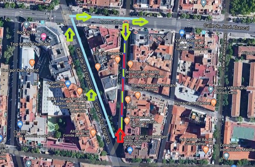 El actual tránsito de los coches en la calle Ponzano es el color rojo, y la propuesta apuesta por cambiar el sentido, accediendo desde la calle José Abascal, que sería el color verde en la calle Ponzano. Ya que el recorrido, que se pueden saltar por semáforo y más distancia, sería el actual que va desde la calle Santa Engracia y gira a José Abascal, dibujado en verde.