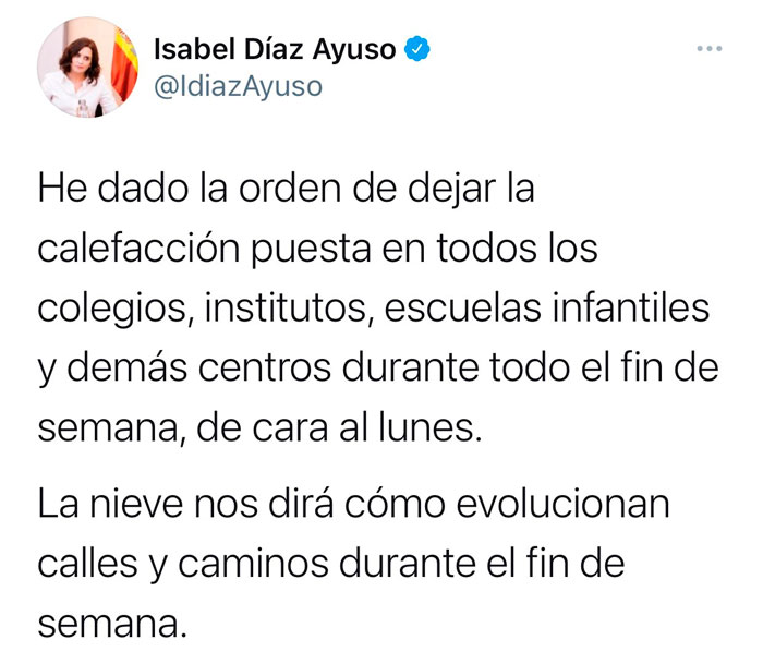 La propia jefa del ejecutivo autonómico ha añadido que la evolución de la borrasca será precisamente la que determine las nuevas medidas que la Comunidad de Madrid, administración competente en el ámbito educativo, implemente para mitigar el frío en los centros educativos de la región.