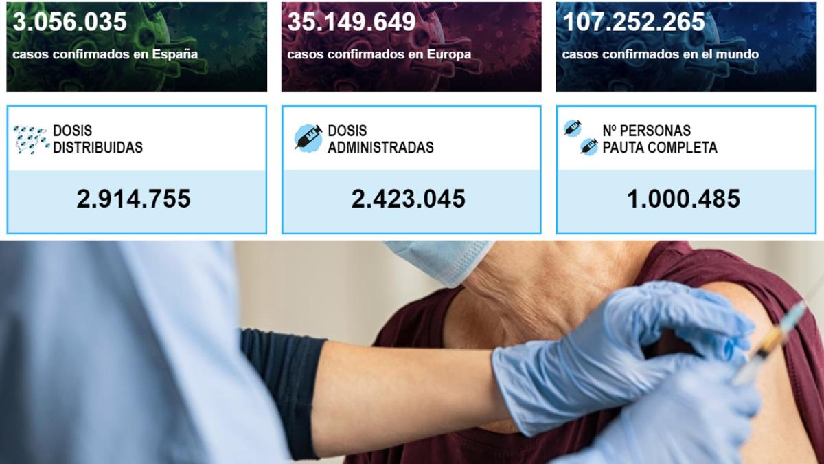 En nuestro país, se han confirmado hasta el momento un total de 3.056.035 casos. Además, se han distribuido a las CC.AA. un total de 2.914.755 dosis de las vacunas de Pfizer, AstraZeneca y Moderna.